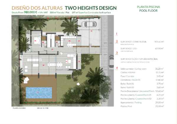 Con parcelas de 500 m², estas villas cuentan con 4 o 5 amplios dormitorios, 4 elegantes baños y espacios abiertos que maximizan la luz natural. Disfruta de un jardín privado con piscina, perfecto para relajarte y disfrutar del clima mediterráneo durante todo el año.