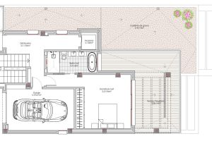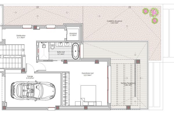 The villa is designed across three levels, linked by internal stairs and an elevator. On entering through automatic gates, you reach the upper floor's garage entrance, which also features an outdoor parking space for an additional car.