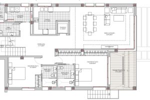 Descending from the upper floor, the main level features an open-plan kitchen that seamlessly integrates with the living and dining area. This floor also includes a laundry room, a guest toilet, and two double bedrooms with en-suite bathrooms.